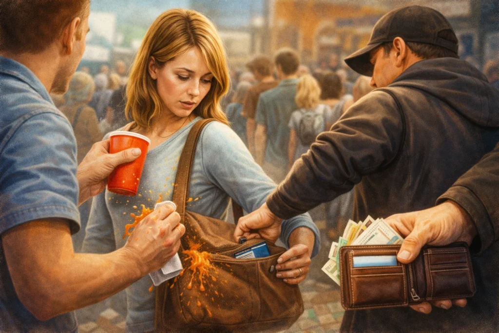 How it works: One person distracts you (asking for directions, spilling something), while another steals your belongings.
